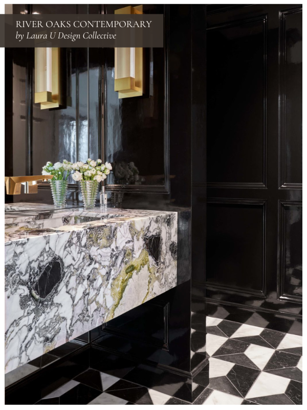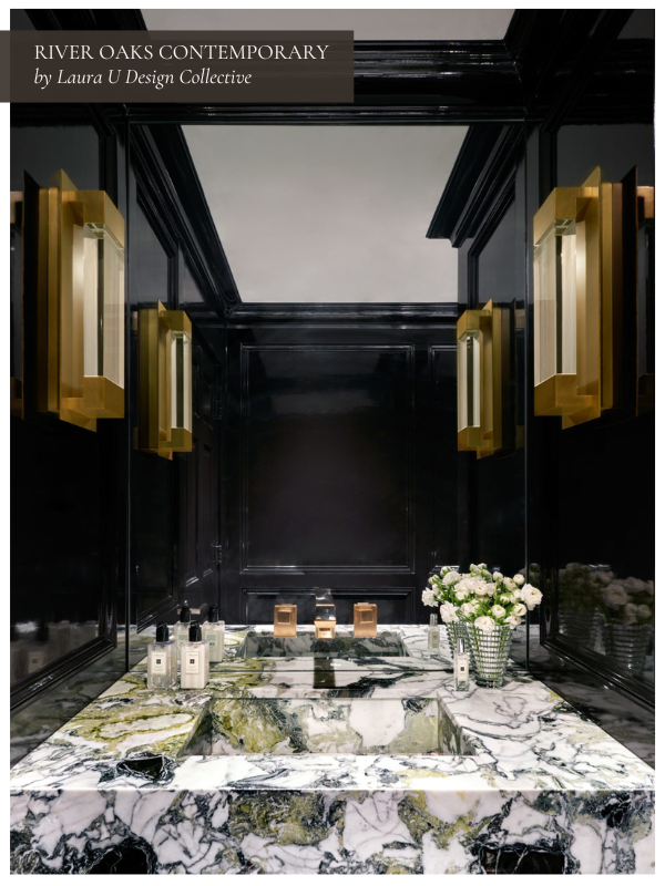 In our River Oaks Contemporary project, a gorgeous powder bath captures the home’s unapologetic drama. This space is a statement, with every element calling your attention, from the lacquered black millwork to the marble vanity threaded with veins of green and gold. Like any black and white interior, it is a study in contrast: dark and luminous, polished and organic.