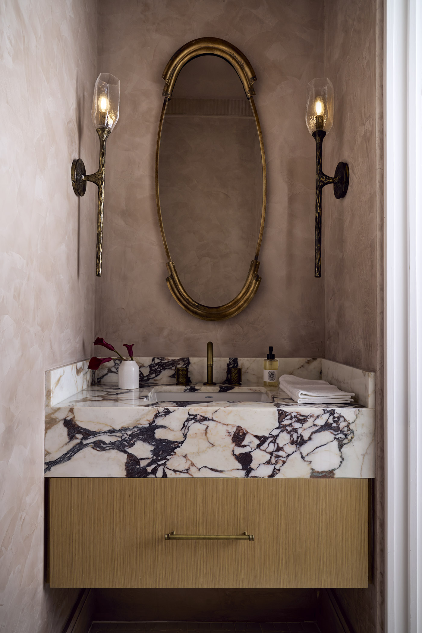 In the powder bath, blush Segreto plaster walls and a bold marble vanity transform a small space into a jewel box, echoing the home’s balance of refinement and serenity.